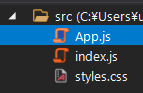 コード全体を一番下に示すけど、src/App.js の中身になる。実行自体は、コマンドプロンプトから package.json があるフォルダへ行き、npm start でlocalhostのブラウザを立ち上げる。package.json から /src/index.js が呼び出され、さらに index.js から SampleApp_user01 を呼び出している。SampleApp_user01 から Square, MyButton への参照という構成。