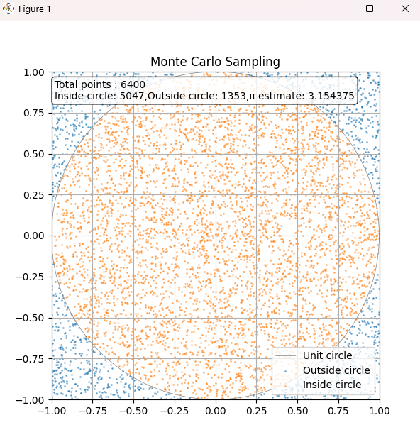 実行結果が下。青の点が円の外にプロットされるもの、橙が円の内。プロットした点の数から近似値を計算して結果を表示。