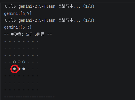 回答のフォーマットを指定しないと出てきた回答をうまく処理できないので、[3, 5]のように回答を指定。これで何手かはうまくいった。下の実行結果では[5, 3] の回答が返ってきて、置くことができた(赤丸部分)。