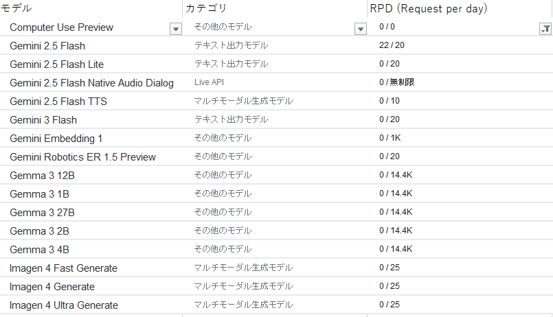 サイトで他のモデルを表示させるといろいろと出てくる。前に見たときはGemini 2 Flashなど以前のバージョンで20より多くの回数が実行できると思ったけど、今見ると上限は0となっていた。0/0以外は下のモデル(使っているGemini 2.5 Flashは22/20となっており上限を超えている)。