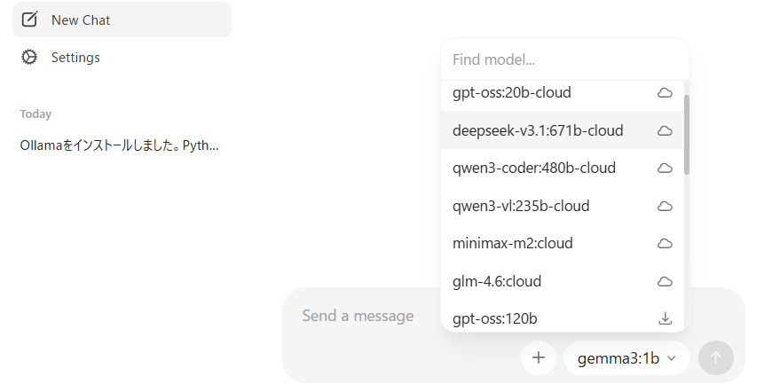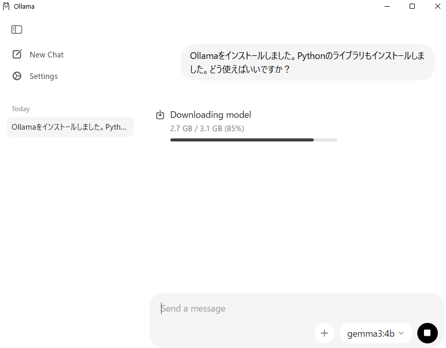 生成AIで使う頭の部分もローカルにダウンロードする必要があるらしく、Gemma 3 4bでは3.1GB、1bでは800MBぐらい必要だった。