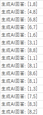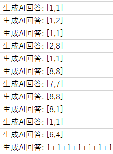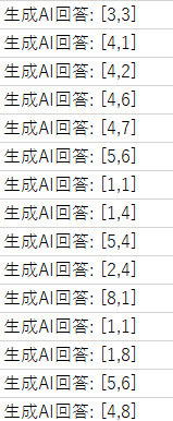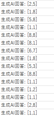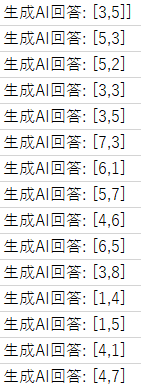 回答を見る限り、無効な手、同じ手を繰り返し出力するといったことは避けられている。よく分からない回答となった場合は回答を処理しないように修正(例えば、[x,y]の5文字分に区切って左端の文字が"["となっている場合のみそれ以降の処理を通す)。
