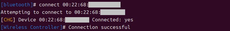 6.ここまでで接続準備は整った。あとは"pair 機器の番号(上の00:22:68 ~)"、"connect 機器の番号"で接続。接続できると[bluetooth]の部分が[Wireless Controller]のように接続先の名称に変わるよう。