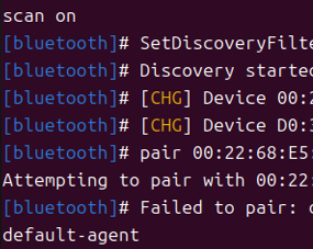 5.検索で出てこない場合は、コマンドプロンプトに戻って([bluetooth]#でexit)、sudo systemctl restart bluetooth(bluetoothサービスを再起動)を入力して、再度bluetoothctlで検索。検索にかかると下のような表示になる([CHG] Device ... となる)。