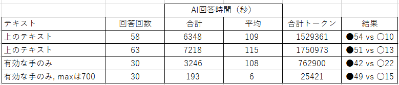 有効な手のみにしたところ、無効な手の回答がなくなった分、トータルでは時間が短くなったけど、1手毎の時間は短縮されていない。そこに追加してmax_output_tokensを700に設定したところ劇的に速くなった。ただ、思考や出力に使うトークンを制限しているだけだと思うので、常にまともな回答がくるか不安。実際に20などに設定してプログラムを実行すると、意図しないテキストを出してエラーになることもあった。安定して1ゲームが3分程度で終了するなら統計処理ができるぐらいの数をこなせそう。また、今回もランダムに対して実施したところ全てAI側が勝ちとなった。
